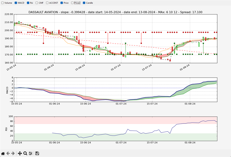 Un jour j'achèterai des DASSAULT AVIATION mais pour l'instant la tendance est mauvaise très mauvaise même. Pourtant les nouvelles ne sont pas alarmantes le 28/03/2024 un protefeuille offensif préconise d'en acheter 36 à 207.4 depuis les 207 sont bien loin.